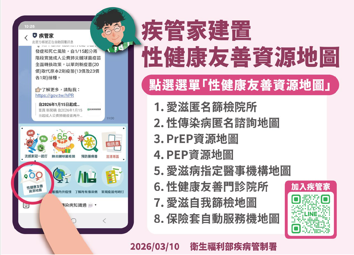 疾管署指出,為提升國人性傳染病防治知能及提升篩檢可近性,已於Line@疾管家建置「性健康友善資源地圖」,內容包括愛滋自我篩檢/匿名篩檢院所及指定醫事機構、性傳染病匿名諮詢、PrEP及PEP資源、性健康友善門診院所及保險套自動服務機等,民眾可依需求及所在位置搜尋相關資訊。另,如符合M痘接種條件民眾,包括:近1年有風險性行為者(例如:多重性伴侶、性交易服務者、於營業場所發生性行為者等);過去曾罹患性病;或性接觸對象有前述任一情形者等,應儘速完成2劑公費M痘疫苗接種,公費接種醫療院所相關資訊可至疾管署全球資訊網/M痘專區/M痘疫苗/M痘疫苗接種服務合作醫療院所項下( https://gov.tw/3SG )查詢,一起守護健康;如有相關疑問,亦可撥打國內免付費防疫專線1922(或0800-001922)洽詢。